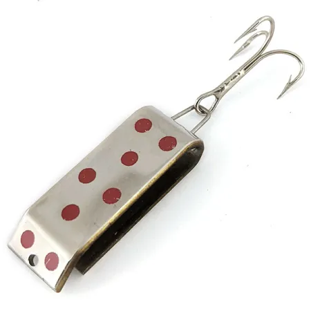 Acht opvallende rode stippen sieren het gepolijste nikkelen oppervlak van deze Lil Jake, wat zorgt voor een klassiek visueel hoog contrast dat al generaties lang forellen om de tuin leidt. Met een lengte van 3,5 cm (1 1/2") en een gewicht van 9 g (1/3 oz) toont dit exemplaar van Jake's Lures, met productcode 16053, een slim Amerikaans ontwerp dat het midden houdt tussen een lepel en een spinner. Het lichaam heeft een kenmerkend gevouwen profiel, dat korter en breder is dan standaard lepels om aanzienlijke trillingen en schitteringen te produceren, zelfs bij een trage inhaalbeweging of tijdens het trollen. In een uitstekende staat (5/5) is de nikkelen afwerking helder en blijven de rode stippen scherp gedefinieerd op het metaal. De hardware is eveneens goed bewaard gebleven, met een stevige dreg die is bevestigd via een eenvoudig maar effectief draadsysteem. Hoofdzakelijk ontworpen voor diep, helder water, blijft het een vaste keuze voor sportvissers die zich richten op zalmachtigen.