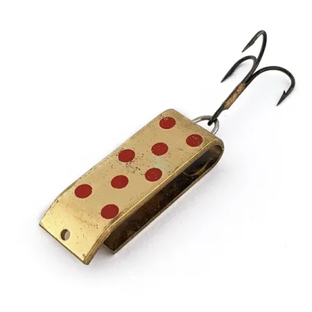 Rode stippen sieren een klassieke goudkleurige afwerking op dit vintage metalen kunstaas van 3,5 cm (1 1/2"). Dit exemplaar, bekend onder productcode 18180, heeft een uniek ontwerp van gevouwen metaal dat de eigenschappen van een lepel en een spinner combineert. Met een gewicht van 9 g (1/3 oz) is de Lil Jake perfect uitgebalanceerd voor nauwkeurige worpen in beken of meren. Dit in de VS (Wyoming) vervaardigde kunstaas vertoont sporen van zorgvuldig gebruik, wat resulteert in een conditie-score van 4/5. De vergulding behoudt een heldere glans op het rechthoekige frame, dat overgaat in een scherpe knik nabij het bevestigingsoog. Een donkere dreg is stevig bevestigd met een robuuste splitring aan de achterzijde, wat de functionele bruikbaarheid weerspiegelt die typerend is voor de vroege Jake's Lures-productie.