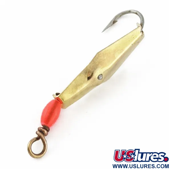 Verguld metaal vormt de slanke, ruitvormige body van dit zeldzame item van 1/8 oz (4 g), een stuk dat het jarenlange vakmanschap van James E. Clark laat zien. Met een lengte van 6 cm vertegenwoordigt deze Clark Spoon 00 met productcode 24355 een reeks Amerikaanse zoutwaterlepelvissen die voor het eerst verschenen in 1927. De constructie kenmerkt zich door een dun, langwerpig profiel in combinatie met een ingebouwde wartel, ontworpen om het kinken van de lijn te voorkomen tijdens het trollen op snelzwemmende soorten zoals Spaanse makreel, blauwbaars of bonito. Een opvallende rode kraal is bij de kop geplaatst en voegt een kleuraccent toe tegen de gouden afwerking en de stevige, vaste haak. Dit exemplaar is in uitstekende staat bewaard gebleven, gewaardeerd met 5/5, waardoor het heldere reflecterende oppervlak behouden is gebleven dat nodig is voor het beoogde gebruik. Ontworpen om achter een planer of inline gewicht te worden getrolld, produceert de lepel een snelle, levendige fladderende actie in het water om een gewonde aasvis te simuleren.