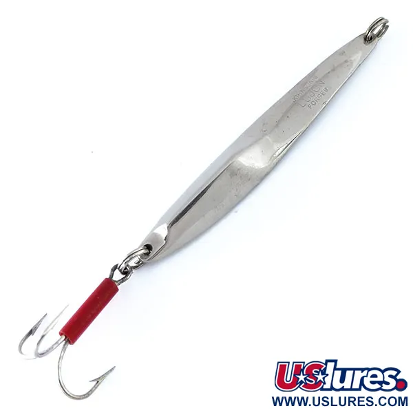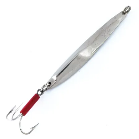 In het vernikkelde metaal is duidelijk het kenmerk "JOHNSON LUJON 1" gestempeld, wat dit kunstaas markeert als een authentiek stukje Amerikaanse hengelsportgeschiedenis. Met een gewicht van 31 g (1 oz) is het zware, slanke lichaam van het kunstaas specifiek gebouwd voor verticaal jiggen in diep water of voor verre worpen tegen de wind in. Het profiel van 9 cm (3 1/2") heeft een unieke, asymmetrische torsie in het metaal, een ontwerpkenmerk dat bedoeld is om het licht vanuit meerdere hoeken te vangen. Dit exemplaar verkeert in een nette 4/5 conditie en toont de hoogwaardige nikkelen afwerking waar Johnson om bekend stond tijdens hun productiejaren in de USA. Een opvallend detail is de felrode tube op de steel van de dreg, die dient als een klassiek visueel richtpunt voor roofvissen. Uitgerust met zware splitringen bij zowel de kop als de staart, weerspiegelt dit kunstaas, productcode 11094, de robuuste constructie van jigging-materiaal uit het midden van de vorige eeuw.