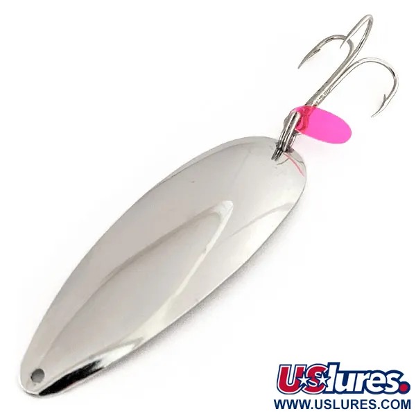 Het klassieke gewicht van 1/2oz (14g) maakt dit exemplaar tot een veelzijdige keuze voor het werpen of licht slepend vissen door verschillende waterlagen. De gepolijste nikkelafwerking zorgt voor een hoogglanzende schittering, een kenmerkend aspect van de oudere in de VS geproduceerde Johnson Sprite-kunstaasjes voordat de productie naar het buitenland werd verplaatst. Dit kunstaas, herkenbaar aan productcode 11256, vertegenwoordigt een tijdperk van lokaal vakmanschap dat verzamelaars waarderen om de materiaalkwaliteit. Op de achterzijde is de naam 'Johnson Sprite' duidelijk in het metaal gestempeld, wat zorgt voor een authentieke merkidentiteit voor elke vintage tackle-collectie. Een kleine, felrode plastic attractor-tab is op de splitring gemonteerd naast de dreg, waardoor een duidelijk visueel focuspunt ontstaat tegen het zilveren lichaam. Met een lengte van 2 3/4" (7 cm) is het druppelprofiel van de lepel ontworpen voor consistente prestaties. Dit item verkeert in uitstekende staat en krijgt een score van 5/5 vanwege het heldere, spiegelachtige oppervlak en het goed bewaarde originele beslag.