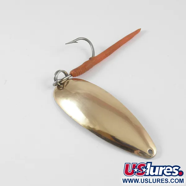 Met een gewicht van 17g (3/5oz) is deze Johnson Sprite een klassiek stukje Amerikaanse hengelsportgeschiedenis, vervaardigd in de tijd dat de productie nog in de VS plaatsvond. Met een lengte van 7 cm (2 3/4") heeft de lepel een slank, langwerpig profiel dat is ontworpen voor zowel werpen als trollen. Dit exemplaar, met productcode 2957, is uitgevoerd in een combinatie van koperen en zilveren afwerkingen die verschillende schitteringen bieden voor wisselende lichtomstandigheden. De bolle kant van de metalen body is duidelijk voorzien van de naam van de fabrikant en het model, wat het vakmanschap van vintage Johnson-materiaal benadrukt. Aan de achterzijde is een enkele haak gemonteerd met een splitring, voorzien van een feloranje plastic trailer die zorgt voor een opvallend contrast met de metalen body. Dit kunstaas verkeert in 5/5 conditie en lijkt ongebruikt met volledig intacte reflecterende oppervlakken en hardware.