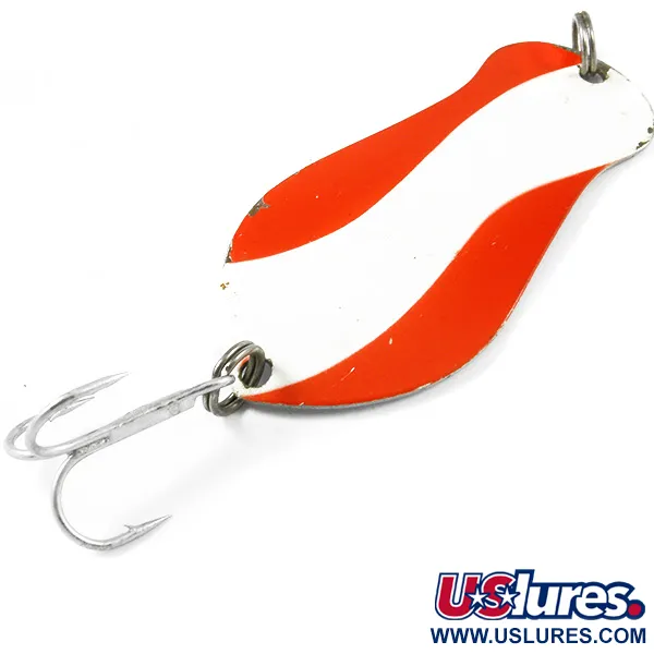 Gepolijst nikkel aan de achterzijde is voorzien van een duidelijke stempel die dit exemplaar identificeert als een K-B Amasa, Mich. maat 2. Met een lengte van 6,5 cm (2 1/2") en een gewicht van 14 g (1/2 oz) is de K-B Spoon 2 een robuust stuk Michigan hengelsportgeschiedenis, door Amerikaanse vissers vaak bestempeld als hét kunstaas voor het vangen van grote vis. De bolle zijde is versierd met een klassiek rood-wit golvend streeppatroon op een helderwitte basis, een opvallend kleurenschema bedoeld voor het vissen op snoek en musky onder diverse wateromstandigheden. Onder productcode 3263 behoudt deze lepel zijn originele hardware, inclusief twee robuuste splitringen en een scherpe, zilverkleurige dreg. Dit specifieke item verkeert in uitstekende staat en verdient een 5/5 score voor de goed geconserveerde lak en de reflecterende metalen afwerking. Gefabriceerd door K-B Bait Co. in de USA, is de solide uitvoering geschikt voor zowel werpen als trollen. De gestempelde "2" op de achterkant komt overeen met de maatvoering die de werkplaats in Amasa hanteerde tijdens de productieperiode.