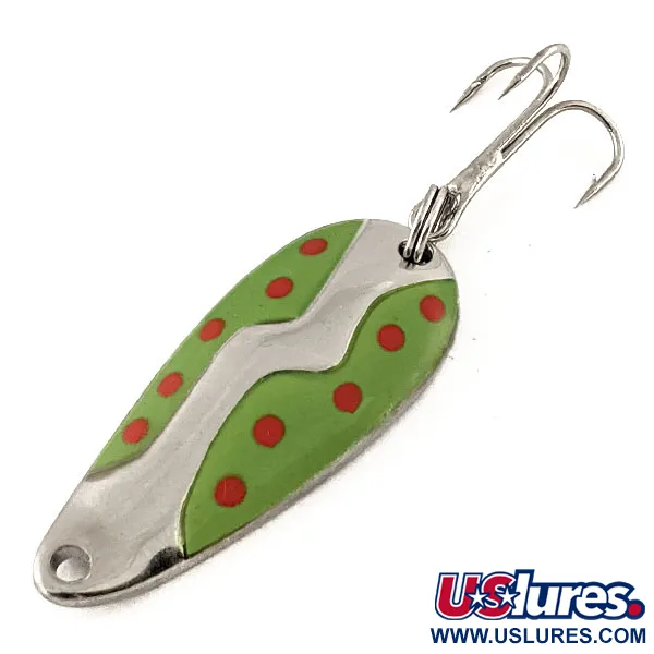 Een vernikkelde laag dient als glanzende basis voor de contrastrijke Groen / Nikkel afwerking op deze 4,5 cm (1 3/4") lepel. Op de achterkant zijn de naam Kamlooper en het Acme-merkmerk duidelijk gestempeld, wat dit exemplaar identificeert als een authentiek Amerikaans product uit de VS. Met een gewicht van 11 g (2/5 oz) heeft het kunstaas een kenmerkend gegolfd patroon op de voorkant, waarbij de groene verf wordt geaccentueerd door kleine, levendige rode stippen. Dit specifieke exemplaar, geïdentificeerd door productcode 12168, verkeert in uitstekende 5/5 conditie, met een gepolijst oppervlak en een scherpe dreg bevestigd via een stevige splitring. Het druppelvormige profiel is een vaste waarde voor sportvissers die op forel en zalm vissen, waarbij het reflecterende nikkelen oppervlak de opvallende geschilderde details aanvult tijdens het binnenvissen of trollen.