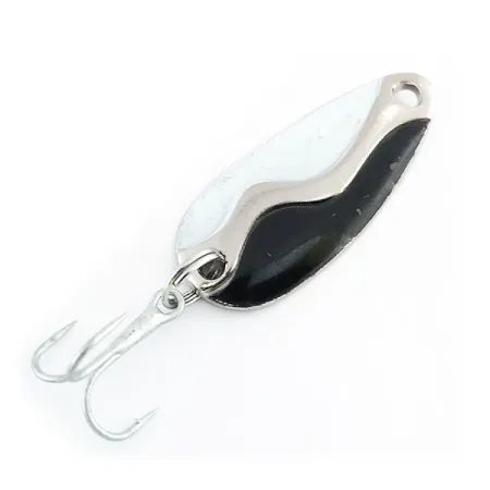 Met een veelzijdig gewicht van 7 g (1/4 oz) heeft deze in Amerika gemaakte lepel een opvallende driekleurige lay-out op de bolle zijde. De afwerking is verdeeld tussen effen zwart en wit emaille, gescheiden door een kenmerkende gebogen gepolijste nikkel golflijn over de gehele lengte. Met een lengte van 3,5 cm (1 1/2") draagt deze Acme-creatie, herkenbaar aan productcode 9801, de naam van de fabrikant en het modelstempel duidelijk op de achterzijde. Het contrastrijke Zwart / Wit / Nikkel patroon zorgt voor een aanzienlijke visuele schittering tijdens het werpen of trollen. Wat betreft het beslag is hij uitgerust met een stevige splitring en een scherpe dreg. Dit exemplaar verkeert in uitstekende staat, met een score van 5/5, waarbij de lak en de vernikkeling hun originele glans hebben behouden. Geproduceerd in de USA, benadrukt de vervaardiging het duurzame metaalwerk en de kwaliteitsafwerking die kenmerkend zijn voor vintage Acme-materiaal.