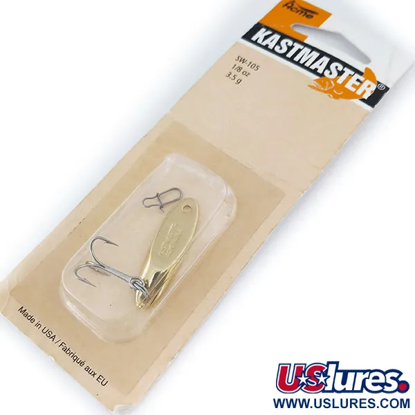 Een goudkleurige afwerking op een massief messing basis kenmerkt deze 1/8 oz (3,5 g) blinker van Acme. Met een lengte van 1 1/2" (3,5 cm) draagt het kunstaas productcode 10909 (SW105/G) en bevindt het zich nog in de originele vintage verpakking. Omdat het ongebruikt is, verkeert het exemplaar in topconditie, waarbij de afwerking de hoogwaardige glans vertoont die verwacht mag worden van Amerikaans fabricaat. De Kastmaster onderscheidt zich door zijn balans, bereikt door een specifieke legering die een unieke actie bevordert tijdens zowel het afzinken als het binnenvissen. Deze veelzijdigheid maakt het een essentieel onderdeel voor het vissen op roofvis in diverse omgevingen, van diepwater jiggen tot het vissen in sterke stroming. Bij de lepel is een fabrieksdreg en een metalen speld inbegrepen, zodat deze direct klaar is voor gebruik op een lichte setup. De achterzijde van de kaart beschrijft de brede inzetbaarheid voor zowel zoet- als zoutwatersoorten, wat een ontwerp benadrukt dat al decennia favoriet is bij ervaren sportvissers.