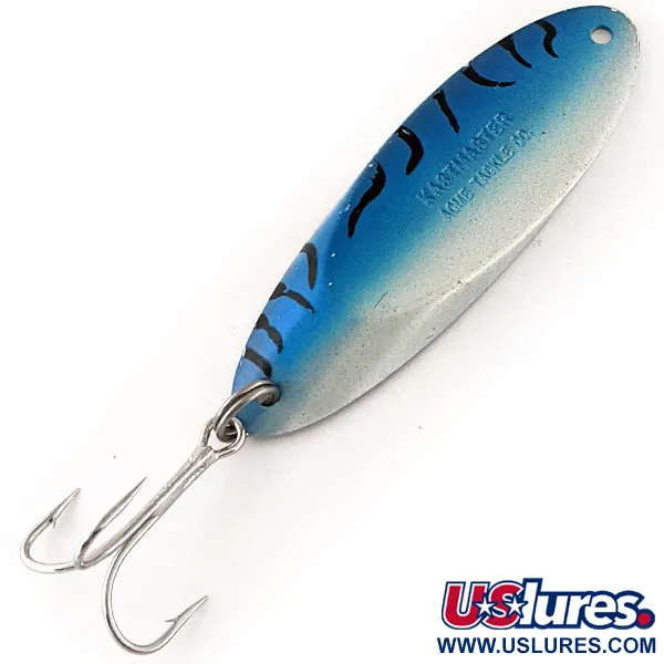 Met een aanzienlijk gewicht van 56 g (2 oz) is deze zware lepel een schoolvoorbeeld van Acme's Amerikaans vakmanschap. De lichtblauwe afwerking gaat over in een glanzende nikkelen basis, geaccentueerd door zwarte golvende strepen in makreelstijl over de bovenste helft van het lichaam. In de metalen flank is het merk "KASTMASTER ACME TACKLE CO." gestanst, wat de herkomst en het model bevestigt. Met een lengte van 8,5 cm (3 1/4") is het dikke profiel ontworpen voor diepwater jigging of het werpen in sterke stroming. De hardware bestaat uit een robuuste dreg die is bevestigd met een splitring aan de staart en een voorgeboord oog aan de taps toelopende neus. Met een conditiescore van 5/5 behoudt het kunstaas zijn originele glans en scherpe kleurdefinitie. Dit exemplaar met productcode 12138 staat bekend om zijn veelzijdigheid in alle seizoenen en behoort tot de grotere modellen van de Kastmaster-serie, gebouwd voor het vissen op grote roofvissen.
