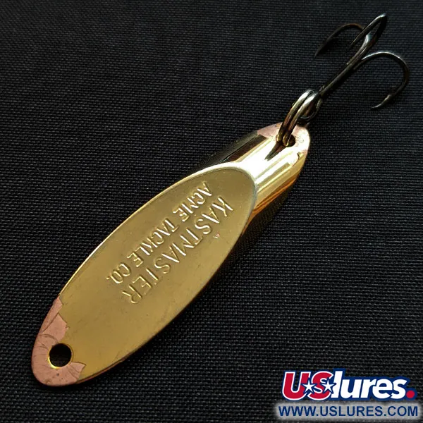 Deze metalen lepel van 4,5 cm is voorzien van een klassieke gouden afwerking, waarbij de merknaam 'KASTMASTER ACME TACKLE CO.' diep in het metaal is gestempeld. Met productcode 18069 is het gewicht van 7 gram bereikt door een specifieke legering die het kunstaas perfect balanceert voor zowel verticaal jiggen als het maken van verre worpen. Het ontwerp heeft schuine facetten die inspelen op de waterweerstand, waardoor het ideaal is voor gebruik in sterke stroming of diep water. Dit in de VS gemaakte exemplaar is uitgerust met een donkere dreg die is bevestigd met een robuuste splitring. Met een conditiescore van 4/5 behoudt het kunstaas een helder reflecterend oppervlak met slechts minimale sporen van gebruik bij de uiteinden.