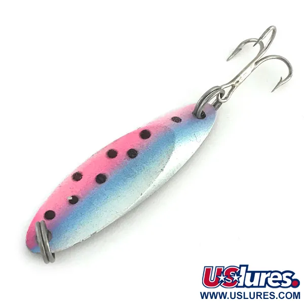 De nikkelen achterzijde zorgt voor een basis met veel schittering voor het forelkleurpatroon op deze 7 g (1/4 oz) lepel. Geproduceerd in de VS onder productcode 9340, vertrouwt het originele Acme-ontwerp op een specifieke metaallegering die ervoor zorgt dat de balans behouden blijft tijdens het binnenvissen of afzinken. Het forelpatroon zelf vertoont levendige roze en blauwe kleurverlopen langs de bovenrand, geaccentueerd door zwarte stippen die een kleine aasvis nabootsen. Met een lengte van 4,5 cm (1 3/4 inch) is dit exemplaar een veelzijdige keuze voor wie op roofvis vist in diep water of sterke stroming waar een compact, aerodynamisch profiel nodig is. De lak en metaalafwerking zijn in topconditie, met een score van 5/5. De hardware is compleet met een stevige dreg, bevestigd via heavy-duty splitringen aan beide uiteinden.