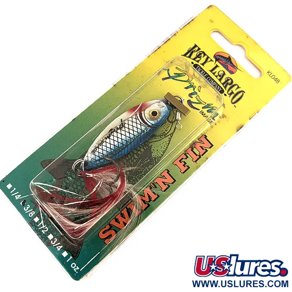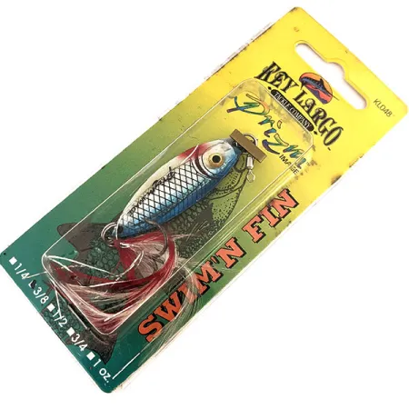 Regenboog lichtblauwe visschubben glinsteren over het 4,5 cm (1 3/4") lange lichaam van deze Key Largo Swim'n Fin, een vintage metalen jig met de kenmerkende holografische Prizm Image-afwerking van de fabrikant. Met een gewicht van 11 g (2/5 oz) is dit specifieke exemplaar, geïdentificeerd door productcode 11290, geassembleerd in de Dominicaanse Republiek met Amerikaanse componenten. Het ontwerp bevat een realistisch gevormd 3D-oog en een robuuste crane-wartel aan de neus voor een veilige lijnverbinding. Aan de achterzijde voegt een handgebonden flash-veren dreg voor zoutwater een vleugje karmijnrood toe aan het zilveren en blauwe profiel. Als ongebruikt item in de originele blisterverpakking verkeert het kunstaas in onberispelijke staat. Dit in Ft. Myers, Florida gevestigde merk heeft de Swim'n Fin specifiek ontwikkeld met een gestroomlijnd profiel om kleine aasvisjes na te bootsen via verschillende werp- of verticale jigtechnieken.