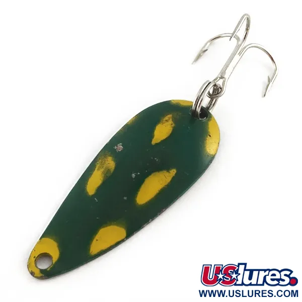 Het groen-gele kikkerpatroon accentueert het profiel van deze 3/16 oz (5 g) Keystone lepel. Dit kunstaas uit de VS heeft een lengte van 4,5 cm (1 3/4") en is gecatalogiseerd onder productcode 23494. De laklaag vertoont natuurlijke ouderdomssporen, wat dit goed onderhouden exemplaar een conditiescore van 4/5 oplevert. De lepel is uitgerust met een stevige splitring en een glanzende dreg aan de achterzijde, terwijl de voorzijde is afgewerkt met een eenvoudig rond bevestigingsoog.