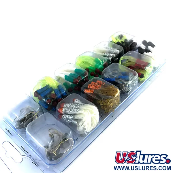 Deze in de fabriek verzegelde organizer is verdeeld in tien verschillende compartimenten en bevat een uitgebreide selectie softbaits van 2" (5 cm) met skirts in octopus-stijl. Het assortiment beschikt over een divers kleurenpalet met blauwe, rode, gele, groene, zilveren, gouden, zwarte en bruine varianten. Vijf specifieke vakken bevatten UV-reactieve kunstaasjes, ontworpen om de zichtbaarheid te vergroten bij weinig licht of in diepere waterlagen. Geproduceerd in de VS door Creme, is de kit specifiek samengesteld voor het jiggen. Elk vak bevat 10 individuele Maxi Tails, wat een totaal van 100 stuks oplevert, samen met 19 verschillende jigkoppen in de bovenste secties van de tray. De set, geïdentificeerd door productcode 8368, bevat zowel effen kleuren met hoog contrast als opties met fijne glitters voor extra schittering. Als ongebruikt item in de originele verpakking krijgt dit exemplaar een conditiescore van 6.