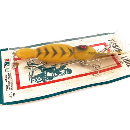 Geproduceerd in Japan voor de S.S. Kresge Company, toont dit vintage exemplaar een gedurfd geel-zwart visgraatpatroon op zijn 8 cm (3 1/4") lange body. Geregistreerd onder productcode 12771, is de Kmart Kresge #381 een drijvende dieploper die ontworpen is om dieptes van 2 m (6,5 ft) te bereiken tijdens het werpen of trollen. Met een gewicht van 14 g (1/2 oz) is hij voorzien van een prominente, extra grote duiklip die zijn profiel en bruikbaarheid voor presentaties in dieper water bepaalt. Het hang- en sluitwerk is nog glanzend en de verf is strak, wat de status van ongebruikt item in de originele verpakking onderstreept. Verzamelaars zullen de klassieke S.S. Kresge-branding op de kaart herkennen, wat verwijst naar de historische rol van de in Michigan gevestigde retailer bij de distributie van Japans kunstaas in het midden van de 20e eeuw. De plug is uitgerust met dubbele dregge bevestigd aan stevige metalen ogen. De contrasterende zwarte strepen zorgen voor een hoge zichtbaarheid tegen de felgele basis, een kleurenschema dat vaak favoriet is in troebel water.