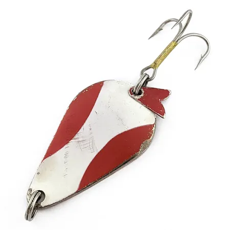 Messing en koperen tinten domineren de achterkant van deze 14 gram (1/2 oz) lepel, waarbij de naam K.O. WOBBLER duidelijk in het metaal is gestempeld. Dit exemplaar, herkenbaar aan productcode 22858, is voorzien van de iconische rood-wit diagonaal gestreepte afwerking op de voorzijde, een klassiek kleurenschema dat vaak wordt gebruikt voor de visserij op snoek en forel. Bij het bekijken van het beslag ziet u een kleine metalen staartvin aan de achterste splitring – een kenmerk van het Acme-ontwerp dat voor extra visuele schittering zorgt. De dreg is stevig bevestigd en heeft een kenmerkende messingkleurige wikkeling op de schacht. Met lichte gebruikssporen verkeert het kunstaas in een goede staat (4/5), waarbij het gestempelde opschrift nog scherp is en de lak grotendeels intact, ondanks lichte ouderdomsslijtage. Dit in de USA gemaakte kunstaas wordt door verzamelaars gewaardeerd om de zware metalen constructie, wat verre worpen mogelijk maakt. Het druppelvormige lichaam loopt strak taps toe naar de bovenste splitring voor de lijnbevestiging.