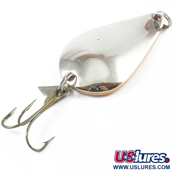 Een chroom- en nikkelcoating bedekt het bolle oppervlak van deze druppelvormige lepel, gecombineerd met een levendige, effen oranje afwerking aan de binnenzijde. Met een gewicht van 21 g (3/4 oz) en een lengte van 5,5 cm (2 1/4") is deze Acme K.O. Wobbler voorzien van het kenmerkende "Sonic flipper tail"-systeem: een kleine metalen vin die aan de achterste splitring is bevestigd naast de dreg. Dit in de VS gemaakte exemplaar, geregistreerd onder productcode 3226, verkeert in 5/5 conditie met een onberispelijke afwerking en goed bewaard gebleven bronskleurige haken. De constructie maakt gebruik van een zware kwaliteit metaal, typerend voor Acme's methode om kunstaas te maken met aanzienlijke massa voor verre worpen. Het kleurcontrast tussen de opvallende oranje binnenkant en de reflecterende nikkelen buitenkant is scherp en duidelijk over het gehele lichaam.