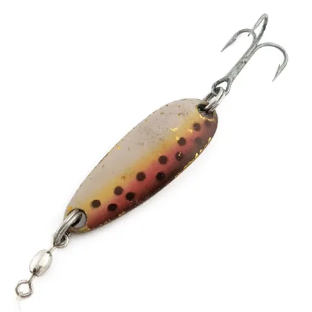 Duidelijk gestempeld op de gepolijste messing achterzijde, markeren de 'LUHR JENSEN' en 'KROCODILE' inscripties de herkomst van deze 4 cm (1 1/2") werplepel. Dit specifieke exemplaar, herkenbaar aan productcode 22434, valt op door de gedetailleerde Brown Trout-afwerking met een warme roodoranje zijlijn en donkere stippen op een metaalachtig oppervlak. Met een gewicht van 9g (1/3oz) is de balans perfect voor werpen, trollen of verticalen. De hardware bestaat uit een tonwartel aan de voorste splitring en een scherpe dreg aan het achtereinde, waardoor hij direct klaar is voor het water of de vitrinekast. Wat de staat betreft, is de conditie een respectabele 4/5, met een nette afwerking die de kwaliteit van de Amerikaanse productie weerspiegelt. Dit ontwerp staat hoog aangeschreven bij verzamelaars vanwege het universele profiel dat zijn actie behoudt, of je nu langzaam binnenvist of op hogere snelheden trolt.