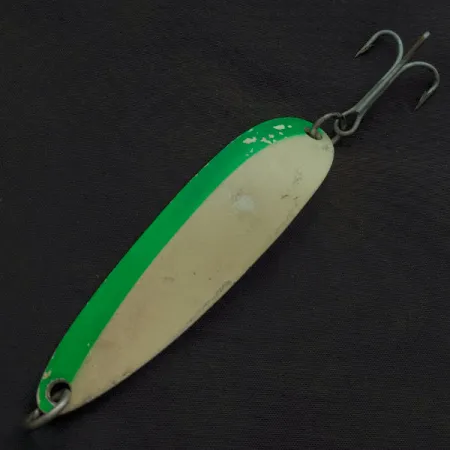 Groene en witte glow-in-the-dark verf vormt een contrastrijk patroon op de bolle zijde van deze Luhr Jensen Krocodile #5, herkenbaar aan productcode 22433. Met een gewicht van 21 g (3/4 oz) is de zware metalen body ontworpen voor werpen, trollen of verticalen, waarbij het cruciaal is om in de strikezone te blijven. Dit in de VS geproduceerde exemplaar is 8,5 cm (3 1/4") lang en heeft de originele reflecterende zilveren afwerking aan de holle achterzijde behouden. Het oppervlak vertoont wat lichte sporen van verblijf in een tacklebox, wat een solide conditiescore van 4/5 oplevert. Een enkele grote dreg is aan de staart bevestigd met een stevige splitring, conform de originele hardware van deze klassieke Luhr Jensen-serie.