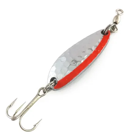 Deze klassieke lepel heeft een lengte van 1 1/2 inch (4 cm) en een kenmerkende gehamerde nikkelen afwerking op de bolle zijde. Een levendige rode streep loopt langs één rand van het gehamerde oppervlak en vormt een scherp visueel contrast met de getextureerde metaalglans. De achterzijde is glad en gepolijst, duidelijk voorzien van de 'LUHR JENSEN KROCODILE' stempel, wat het identificeert als een authentiek stuk Amerikaans visgerei. Met een gewicht van 1/3 oz (9 g) is het dikke profiel ontworpen voor verre worpen en het bereiken van diepere waterlagen. De montage omvat een stevige dreg en een wartel verbonden door splitringen, beide met de schone, reflecterende oppervlakken die kenmerkend zijn voor kunstaas in ongebruikte staat. Als ongebruikt exemplaar vertoont het geen enkel teken van slijtage door bewaring in een tacklebox. Dit specifieke model, geregistreerd onder productcode 7869, staat voor de veelzijdigheid waar Luhr Jensen om bekend staat bij zowel werpend vissen als trollen.