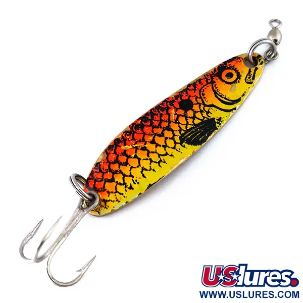 Op de koperen achterzijde van dit exemplaar staat duidelijk de tekst 'KROCODILE DIE # 3' gestempeld, wat dit identificeert als een klassieker uit de fabriek van Luhr Jensen in Hood River, Oregon. Met een gewicht van 1/3 oz (10 g) biedt het metalen lichaam het nodige gewicht voor verre worpen met behoud van een slank, aerodynamisch profiel. De voorzijde heeft een levendig kleurverloop van geel bij de kop naar dieprood bij de staart, met daaroverheen een gedetailleerd zwart schubbenpatroon en een gestileerd visoog. Met een lengte van 5,5 cm (2 1/4") bevat de lepelmontage heavy-duty splitringen die een scherpe dreg en een tonwartel aan de voorzijde verbinden. Dit model, geïdentificeerd door productcode 10410, verkeert in 5/5 conditie met een schone, glanzende koperen afwerking op de achterkant. De gestempelde aanduiding 'Die #3' verwijst naar de specifieke mal die is gebruikt om de kromming van de lepel te creëren, ontworpen om een waggelende actie te produceren die een gewonde aasvis nabootst tijdens het werpen of trollen. De achterzijde is ook voorzien van de originele merkstempel uit de Pacific Northwest.
