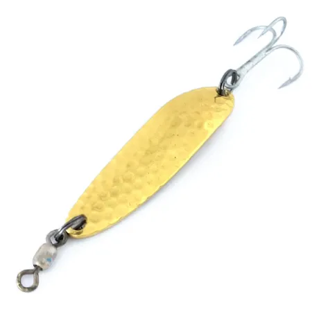Gehamerde gouden oppervlakken zoals die op deze Luhr Jensen Krocodile Die #3 zijn legendarisch voor het vangen van licht en het trekken van de aandacht op afstand in dieper water. Duidelijk gestempeld op de gladde achterkant met 'KROCODILE DIE #3 LUHR JENSEN HOOD RIVER, ORE.', komt dit specifieke exemplaar, geïdentificeerd door productcode 10855, voort uit de historische wortels van het merk in Oregon, USA. Met een lengte van 5,5 cm (2 1/4") en een gewicht van 10 g (1/3 oz), is het compacte, smalle lichaam specifiek ontworpen voor verre worpen of het bereiken van grotere dieptes dan standaard dunmetalen lepels. De voorzijde heeft een diepe gehamerde textuur die de schittering maximaliseert, terwijl de gepolijste koperkleurige afwerking uitzonderlijk schoon blijft. Dit kunstaas verkeert in 5/5 conditie, oogt zeer goed bewaard met scherpe randen en een schone, originele wartel- en dregmontage. Vissers grijpen vaak naar deze zwaardere lepels voor het vissen op zalm of forel wanneer een compact profiel nodig is om effectief door de waterkolom te dringen. De splitringen zijn strak en het materiaal vertoont geen tekenen van slijtage, klaar voor de verzamelvitrine of een trip naar de rivier.