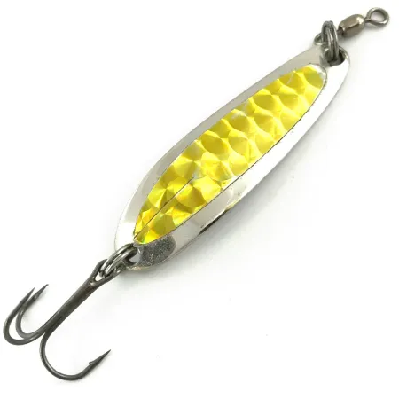 HOOD RIVER, ORE. gestanst in de achterzijde van de nikkelen body benadrukt de klassieke wortels van deze Luhr Jensen lepel. Een levendige gouden hologramtape met een duidelijk honingraatpatroon bedekt de voorkant, ontworpen om licht effectief te vangen terwijl hij door het water beweegt. Met een gewicht van 10 g (1/3 oz) is het smalle model Die #3 zeer geschikt voor verre worpen of het behouden van diepte tijdens het trollen. Met een lengte van 5,5 cm (2 1/4") is het kunstaas uitgerust met een robuuste dreg en een wartel, beide verbonden door sterke splitringen. De kwaliteit is zichtbaar in de diep gedrukte letters op de achterzijde, die de specifieke stempel identificeren die voor de productie is gebruikt. De conditie is beoordeeld als 5/5, waarbij de glanzende nikkelen afwerking op de achterkant en de gouden folie op de voorkant volledig intact zijn. Het is een goed bewaard gebleven exemplaar uit de serie met productcode 5643.