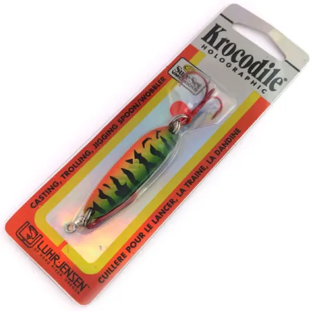 Een opvallende Holographic Green Tiger afwerking kenmerkt deze specifieke Krocodile lepel, met dikke zwarte verticale strepen over een levendig groen en geel verloop. Ontworpen voor veelzijdige toepassingen zoals werpen, trollen en jiggen, draagt dit exemplaar de specifieke productcode 1018-038-1347. Met een gewicht van 1/2oz (14g) en een lengte van 2 1/4" (5,5cm), is het kunstaas gebouwd met een slanke, dik gestanste body die helpt bij het bereiken van grote werpafstanden. De originele verpakking benadrukt de Luhr Jensen traditie uit Hood River, Oregon, en vermeldt de X-Treme Holographic Flash. Deze lepel is uitgerust met een VMC Sure Set dreg en bevat een extra Siwash haak in de blisterverpakking, wat door zowel verzamelaars als sportvissers wordt gewaardeerd vanwege de verschillende regelgevingen per water. Het metalen oppervlak is ontworpen om licht te reflecteren, zelfs bij weinig zicht. Dit exemplaar is ongebruikt, nog verzegeld in de originele winkelverpakking en verkeert in een 5/5 staat.