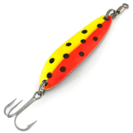Het blad van deze Luhr Jensen lepel is precies in het midden gedeeld en vertoont een opvallende combinatie van levendig geel en dieprood. Met een lengte van 5,5 cm (2 1/4") en een gewicht van 14 g (1/2 oz) heeft deze Krocodile Die #3 UV de dikte die nodig is voor verre worpen, zelfs tegen de gure wind van de Great Lakes in. Dit exemplaar, herkenbaar aan productcode 7523, is gebouwd op een vernikkelde basis die zorgt voor een constante metaalachtige schittering onder het gestippelde patroon. Onder ultraviolet licht verandert de fluorescerende afwerking aanzienlijk: de gele zijde verschuift naar fel neongroen en de rode zijde krijgt een gloeiende oranje tint, terwijl de zwarte stippen duidelijk zichtbaar blijven. Deze zware constructie zorgt ervoor dat het kunstaas snel diepte bereikt bij het werpen vanaf pieren of tijdens het trollen op zalm. Het exemplaar verkeert in uitstekende staat, beoordeeld met 5/5, en is uitgerust met schoon fabrieksmateriaal, inclusief een gemonteerde wartel aan de bovenzijde en een scherpe, stevige dreg. Dit model staat bekend om zijn consistente wiebelende actie bij zowel lage als hoge inhaalsnelheden.