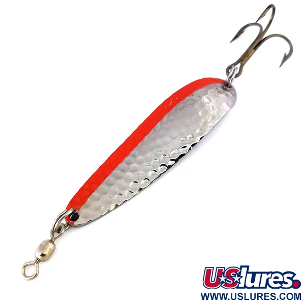 Gehamerde nikkelafwerkingen zorgen voor de primaire schittering op deze 1/2 oz (14 g) Luhr Jensen Krocodile Die #4, een klassiek ontwerp dat geliefd is om zijn dichtheid en werpbereik. Met een lengte van 2 1/2" (6,5 cm) draagt de lepel de productcode 10625 en is hij voorzien van een levendige fluorescerende oranje streep langs de zijkant. Dit oranje element is bijzonder effectief in omstandigheden met weinig licht, omdat het helder oplicht onder UV-licht, waardoor het een standaardkeuze is voor zalmvissers op de Grote Meren die vanaf steigers of diepe oevers vissen. Het dikke, smalle lichaam is ontworpen om door de lucht te snijden en afstanden te bereiken die andere lepels niet halen. De hardware omvat een aan de bovenzijde gemonteerde wartel om uw lijn te beschermen en een stevige dreg. Dit specifieke item verkeert in 5/5 conditie, met behoud van de originele fabriekglans en scherpe verflijnen. Of u nu tegen de wind in werpt of trollend een diepe talud bevist, de gewichtsverdeling zorgt ervoor dat de kenmerkende waggelende actie consistent blijft.