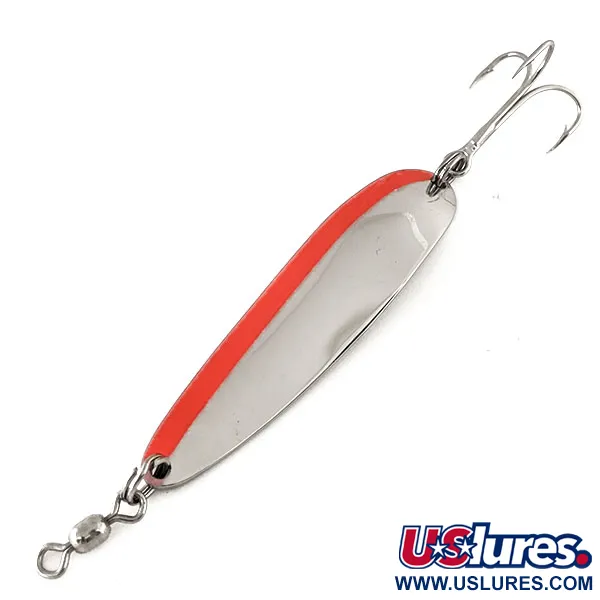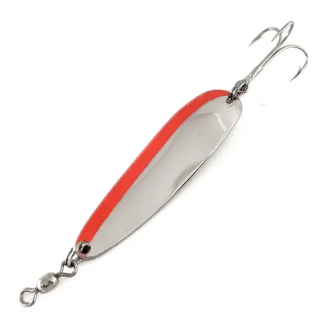 Het gewicht van 1/2 oz (14 g) geeft deze Krocodile Die #4 de dichtheid die nodig is om diep water te bereiken waar zalmen vaak samenkomen. Met een lengte van 2 1/2" (6,5 cm) heeft het kunstaas een hoogglanzend Nikkel / Rood kleurenschema met een duidelijke fluorescerende streep langs één flank voor een hoge zichtbaarheid. Op de achterkant is de metalen lepel duidelijk gestanst met de naam Luhr Jensen en de Krocodile-branding. Deze lepel, geïdentificeerd door productcode 11177, verkeert in 5/5 staat met een schoon reflecterend oppervlak en goed bewaard gebleven fabriekshardware. De dikwandige behuizing is ontworpen om verre worpen vanaf steigers of boten mogelijk te maken, waarbij zijwind effectief wordt doorkliefd. De vorm is technisch ontwikkeld om een gestage wiebelende actie te produceren tijdens het binnenvissen, waardoor het een betrouwbare keuze is voor werpen, trollen en zelfs verticaal jiggen. Uitgerust met een wartel aan de bovenkant en een scherpe dreg aan de staart.