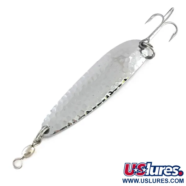 Een gehamerde nikkelafwerking geeft de Krocodile Die #4 een veelzijdig oppervlak dat licht vanuit verschillende hoeken reflecteert. Deze Luhr Jensen lepel, herkenbaar aan productcode 8426, weegt 19g (2/3oz) en heeft een lengte van 6,5cm (2 1/2"). De achterkant van het kunstaas is gestempeld met de naam van de fabrikant, het model "KROCODILE" en de herkomst "Hood River, Ore. Made in USA". Het slanke, verzwaarde profiel is ontworpen voor verre worpen naar diepere zones en vertoont een kenmerkende waggelende actie tijdens het binnenvissen of trollen. De montage bestaat uit een robuuste dreg en een tonwartel, bevestigd via splitringen. Dit exemplaar verkeert in 5/5 conditie, met een heldere metaalglans aan beide zijden en schone, originele onderdelen.