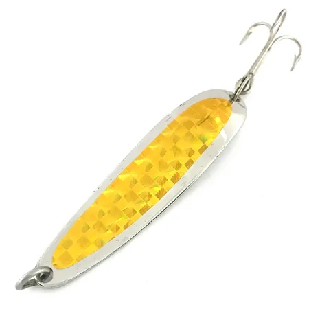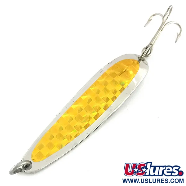 De Krocodile Die #4 is 6,5 cm (2 1/2 inch) lang en is voorzien van een opvallende gouden prismatische tape over een gepolijste nikkelen afwerking. Deze lepel van 14 g (1/2 oz) van Luhr Jensen, met productcode 8533, weerspiegelt het klassieke vakmanschap uit Hood River, Oregon. De smalle, dikke body is kenmerkend voor het Krocodile-ontwerp, bedoeld voor grote werpafstanden of het behouden van diepte tijdens het trollen. Op de achterkant is de fabrikantnaam en locatie duidelijk in het metaal gestempeld, wat de strakke lijnen van de nikkelen basis benadrukt. De montage bestaat uit een stevige splitring en een scherpe dreg, wat de originele fabriekskwaliteit toont. Met een score van 5/5 verkeert dit exemplaar in uitstekende staat, met behoud van de hoge reflectiviteit en de scherpe geometrie van het holografische patroon. De combinatie van de zilverkleurige achterkant en goudkleurige voorkant biedt een veelzijdig kleurprofiel voor vissers die op roofvis jagen.