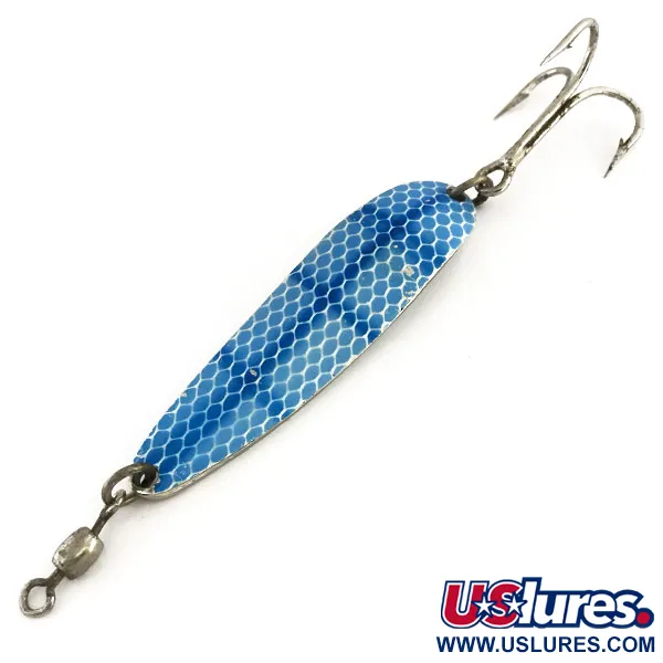 Een opvallend blauw honingraat schubpatroon siert de voorzijde van deze Luhr Jensen Krocodile Die #4, een klassiek ontwerp uit hun productie in de USA. Met een gewicht van 21g (3/4oz) is deze 6,5cm (2 1/2") werplepel gebouwd voor afstand en diepte, vaak favoriet bij vissers die zich richten op trekkende zalm in de Grote Meren. De achterzijde is voorzien van een gepolijste nikkelafwerking, gestempeld met het Luhr Jensen-merk. De lepel, herkenbaar aan productcode 9138, vertoont een karakteristieke wiebelende actie dankzij het dikke, smalle profiel. Hij is uitgerust met een stevige tonwartel aan de neus en een scherpe dreg aan de staart. De afwerking op zowel de blauwe schubben als de nikkelen achterkant is opmerkelijk goed bewaard gebleven, wat een conditiescore van 5/5 oplevert. Of je hem nu werpt vanaf een pier of trolt, de zware gewichtsverdeling zorgt voor een consistente presentatie in diep water.