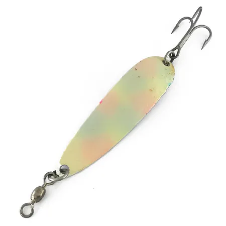 Een gewicht van 25 g geeft deze Luhr Jensen Krocodile Die #5 de dichtheid die nodig is om diepe standplaatsen te bereiken of door een stijve bries aan de waterkant te snijden. Met een lengte van 8,5 cm heeft dit exemplaar een parelmoer basis met een gespikkeld patroon van subtiele roze en groene vlekjes die zorgen voor een gestructureerd visueel profiel. Onder omstandigheden met weinig licht activeert de afwerking zijn glow-eigenschappen, waarbij een duidelijk luminescent groen licht wordt uitgestraald dat essentieel is voor troebel water of nachtsessies. Geregistreerd onder productcode 8266, is de lepel gebouwd op een zware blank die is ontworpen voor afstandsworpen en trollen. De hardware omvat een tonwartel op de voorste splitring om kinken in de lijn te minimaliseren en een stevige dreg aan de achterzijde. Deze in Amerika gemaakte lepel verkeert in 4/5 conditie, met een goed onderhouden afwerking en schone metalen onderdelen. Het smalle, dikke ontwerp is een klassieke keuze voor sportvissers die zich richten op zalm of grote forel en een kunstaas nodig hebben dat zijn diepte behoudt tijdens het binnenvissen.