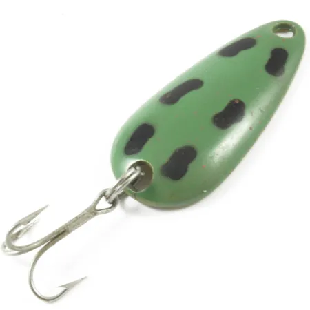 Op de koperen onderzijde staat duidelijk het 'LEN THOMPSON No. 00' merk gestempeld, wat dit een Canadese klassieker maakt. De bovenzijde heeft een matgroene basis versierd met zeven duidelijke zwarte stippen, een patroon dat vaak wordt gebruikt om amfibieën of aasvis te imiteren. Met een lengte van 5 cm (2") en een gewicht van 14 g (1/2 oz), is de lepel vervaardigd uit massief messing, een materiaalkeuze die de fabrikant al sinds 1929 gebruikt om een specifieke balans te garanderen. Deze gewichtsverdeling zorgt voor een langzame, wiebelende actie tijdens het binnenvissen. De hardware bestaat uit een enkele dreg die met een splitring aan de achterzijde is bevestigd, terwijl er een bevestigingsoog aan de spitse neus zit. Gecatalogiseerd onder productcode 3217, verkeert dit exemplaar in 4/5 conditie, met goed bewaarde verf aan de bovenzijde en een heldere, schone messing afwerking aan de achterzijde. Werpen of trollen met deze lepel is een traditionele methode voor het vissen op snoek, zalm en meerforel.