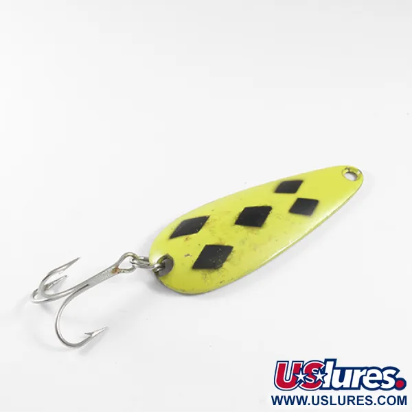 Vijf zwarte ruiten in het klassieke patroon op een levendige gele afwerking bepalen de esthetiek van deze in Canada gemaakte lepel. Met een gewicht van 3/4 oz (21 g) en een lengte van 2 3/4" (7 cm) biedt dit model in maat #1 een aanzienlijk profiel voor het vissen op snoek of meerforel. De achterkant met messing afwerking is voorzien van de ingestempelde naam van de fabrikant, Len Thompson, wiens productietraditie in de regio teruggaat tot 1929. Dit exemplaar, met productcode 1748, vertoont lichte gebruikssporen op de lak en het metaal, maar verkeert in een conditie van 4/5. Een zilverkleurige dreg is aan de achterkant bevestigd via een sterke splitring, waardoor hij klaar is voor werpen of trollen. De specifieke kromming van het metaal is ontworpen om een langzame, waggelende beweging te creëren tijdens het binnenvissen. De messing basis blijft zichtbaar op de achterzijde en zorgt voor een subtiele schittering als contrast met de opvallende gele voorzijde.