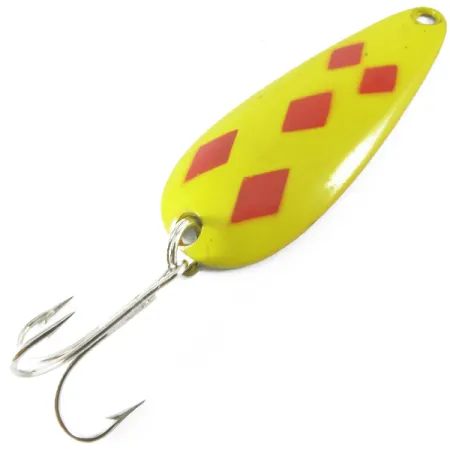 De massief messing constructie van 21 g (3/4 oz) maakt deze 7 cm (2 3/4") Len Thompson #1 een favoriet voor het vissen op snoek en meerforel. De "Five of Diamonds" afwerking is vakkundig aangebracht, met vijf scherpe rode ruiten tegen een levendige gele achtergrond. Op de achterkant vindt u het klassieke fabrikantenstempel gedrukt in het schone messing oppervlak. Dit specifieke exemplaar, geïdentificeerd door productcode 3682, verkeert in 5/5 conditie, met een hoogglans lak en een heldere glans op het metaal. Sinds 1929 worden deze in Canada gemaakte lepels geprezen om hun traag waggelende actie die een gewonde aasvis nabootst tijdens het werpen of trollen. Het kunstaas is uitgerust met een robuuste dreg, stevig bevestigd aan de staart om de aanval van een krachtige rover op te vangen.