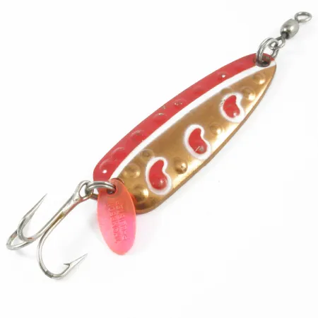 Koperen beplating met gestempelde kuiltjes aan de achterzijde benadrukt het traditionele vakmanschap van Canadese kunstaasproductie. Met een gewicht van 25g (1oz) en een lengte van 7cm (2 3/4") is deze Len Thompson #13 voorzien van een opvallend rood-wit druppelpatroon op een gepolijst koperen body. Dit specifieke item, geïdentificeerd door productcode 3287, verkeert in 5/5 conditie met een glanzende afwerking en goed geconserveerde lak. De hardware bestaat uit een stevige dreg, vergezeld van een doorschijnend roze attractor-vlaggetje en een heavy-duty tonwartel aan de voorste splitring. Op de concave binnenzijde is het merkteken duidelijk in het metaal gestempeld te midden van een gestructureerd oppervlak. Deze lepel is ontworpen voor veelzijdigheid en wordt veelvuldig gebruikt voor werpen of trollen op snoek, zalm en meerforel.