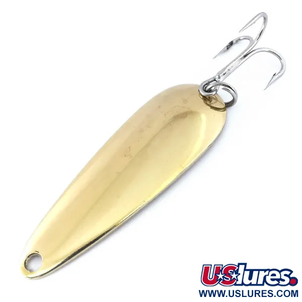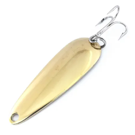 Met een lengte van 3 1/4" (8 cm) is deze massief metalen lepel afgewerkt in glanzend goud, wat zorgt voor een diepe, metalen flits. Deze Len Thompson #2, geregistreerd onder productcode 10732, is met 1 oz (28 g) een zwaargewicht, waardoor hij uitermate geschikt is voor het bereiken van diepere structuren bij het werpen of trollen op snoek en meerforel. De holle zijde van het kunstaas is voorzien van de klassieke "LEN THOMPSON NO. 2" stempel, een kenmerk van de Canadese productgeschiedenis van het merk die begon in 1929. Het uitgebalanceerde ontwerp zorgt voor een langzaam waggelende actie die grotere aasvissen simuleert. De montage omvat een scherpe, zilverkleurige dreg verbonden door een stevige splitring, beide in uitstekende staat. Dit exemplaar verkeert in 5/5 conditie en heeft aan beide kanten een schoon en sterk reflecterend oppervlak. De goudkleur blijft levendig en biedt een hoge zichtbaarheid voor roofvissen in verschillende wateromstandigheden.
