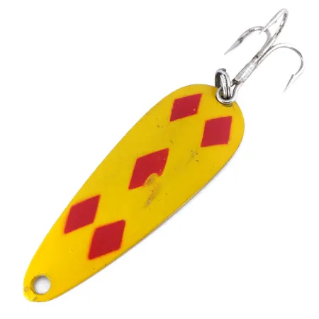 Deze metalen lepel weegt precies 28g (1oz) en is uitgevoerd in het beproefde Five of Diamonds kleurenschema. Het gele emaille is voorzien van vijf rode ruiten, een patroon dat het merk sinds 1929 kenmerkt. De messing achterzijde is gestempeld met 'LEN THOMPSON NO. 2' en de Canadese herkomst. Dit item, gecatalogiseerd onder productcode 10774, is voorzien van een betrouwbare zilverkleurige dreg aan een sterke splitring. De staat is een respectabele 4/5, met lichte gebruikssporen van opslag in de tacklebox. Het zware metaal is ontworpen om de karakteristieke trage, wiebelende actie van het kunstaas te ondersteunen bij het vissen op diepwaterrovers.
