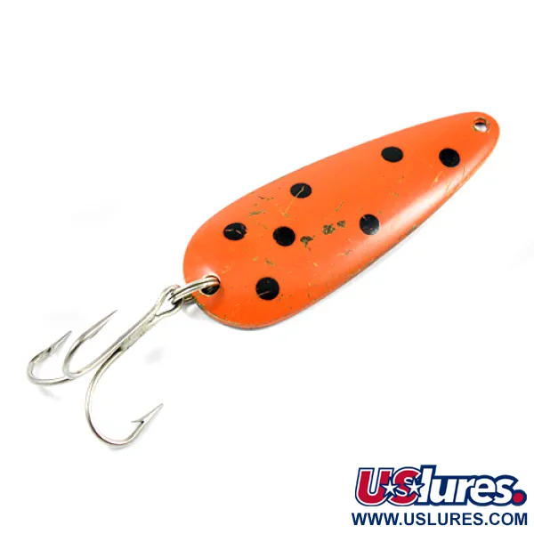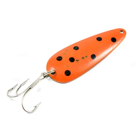 Met een lengte van 8 cm (3 1/4 inch) valt deze Canadese klassieker op door zijn opvallende oranje-rode afwerking en kenmerkende zwarte stippenpatroon. De in de messing achterzijde geslagen stempel "LEN THOMPSON NO 2" identificeert een lepel die ontworpen is voor veelzijdigheid, of je nu sleept op meerforel of werpt in de ondiepten. Dit exemplaar weegt 28 gram (1 oz), draagt productcode 2243 en toont de toewijding van het merk aan balans. Het kunstaas verkeert in een 4/5 conditie, met lichte oppervlakkige krasjes en minimaal lakverlies bij de randen die het karakter geven van zijn tijd in een tacklebox. Uitgerust met een stevige zilveren dreg, is de constructie van de lepel afgestemd op een langzaam waggelende actie die de presentatie van een spartelende aasvis nabootst. De splitringen zijn nog strak en functioneel, klaar voor de volgende worp of een plek in een verzameling.