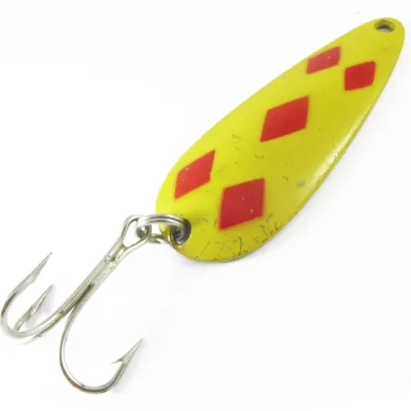 Vijf rode ruiten zijn scherp geschilderd over een heldergeel veld op deze in Canada gemaakte klassieker. Met een gewicht van 28 g (1 oz) heeft deze specifieke lepel (productcode 3681) de traditionele messingkleurige achterkant waar verzamelaars naar zoeken in vroege Len Thompson #2-modellen. Sinds de oprichting van het merk in 1929 zijn deze kunstaasjes gebouwd om het profiel van een kleine witvis na te bootsen, en dit exemplaar van 8 cm (3 1/4") draagt de duidelijke gestempelde belettering op de achterzijde. Uitgerust met een zilveren dreg, is het kunstaas een vaste waarde voor wie werpt of trolt op snoek en meerforel. Het Five of Diamonds-kleurenpatroon is ongetwijfeld het bekendste in de catalogus, bedoeld om een hoge zichtbaarheid te bieden in verschillende wateromstandigheden. Beoordeeld met een conditie van 4/5, vertoont de gele verf wat verspreide krasjes en lichte slijtage door gebruik, hoewel de structurele integriteit van het metaal en het beslag uitstekend blijft. De lepel is ontworpen voor een langzame waggelende actie, een technisch kenmerk dat al bijna een eeuw een constante is voor de fabrikant.