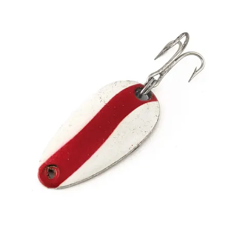 Een diagonale rode streep zorgt voor een scherp contrast met de wit geëmailleerde voorzijde van deze Canadese klassieker. Deze specifieke Len Thompson #6 lepel, vermeld onder productcode 11190, weerspiegelt een ontwerpfilosofie die sinds de oprichting van het merk in 1929 grotendeels ongewijzigd is gebleven. De 1" (2,5 cm) messing body is op de achterzijde duidelijk gestempeld met de naam van de fabrikant en de modelmaat, wat de gepolijste metalen afwerking accentueert. Met een gewicht van 1/8 oz (3,5 g) is het kunstaas ontworpen voor werpen of trollen, bedoeld om het profiel van een kleine aasvis na te bootsen. Het beslag is in uitstekende staat, voorzien van een stevige dreg en splitring. Met een conditiescore van 5/5 is het emaille goed bewaard gebleven en behoudt het messing zijn originele glans. De actie is gericht op een trage, waggelende beweging, een technisch kenmerk dat erom bekend staat aanvallen van meerforel en snoek uit te lokken.