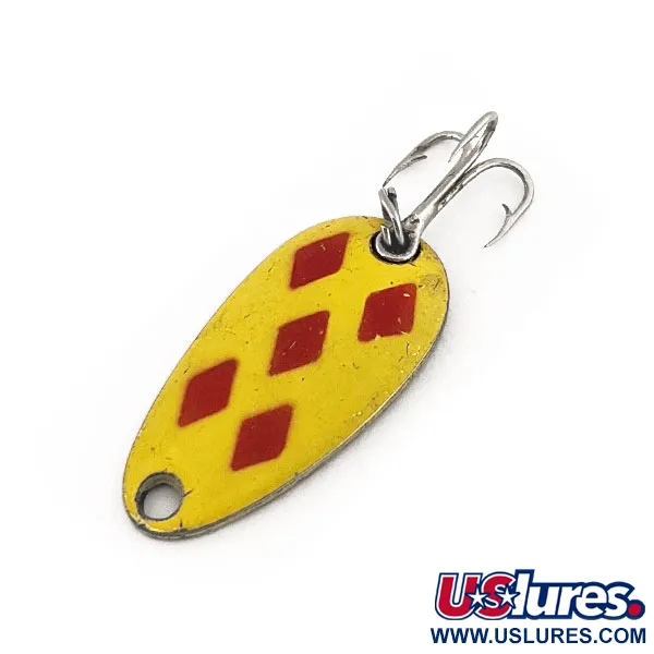 Een compact frame van 1" (2,5 cm) draagt de onmiskenbare geel-rode Five of Diamonds-afwerking op deze Canadese klassieker. Met een gewicht van 1/8oz (3,5g) is de Len Thompson #6 ontworpen met de balans die het merk al sinds 1929 definieert. De achterzijde is voorzien van het authentieke merkteken dat rechtstreeks in het metaal is gestempeld, wat het modelnummer en de historie identificeert. Dit exemplaar, toegewezen aan productcode 11269, behoudt zijn originele levendigheid over het gele emaille en de vijf rode diamantaccenten. Sportvissers vertrouwen vaak op deze lepels voor een traag waggelende actie die kleine aasvisjes nabootst tijdens het werpen, trollen of jiggen op forel en snoek. De montage bestaat uit een stevige dreg die is bevestigd met een splitring. Elk aspect van dit kunstaas weerspiegelt de productienormen die bijna een eeuw geleden in Canada zijn vastgesteld. De staat van het exemplaar is beoordeeld als 5/5, waarbij de verf en het metaal zeer schoon zijn gebleven.