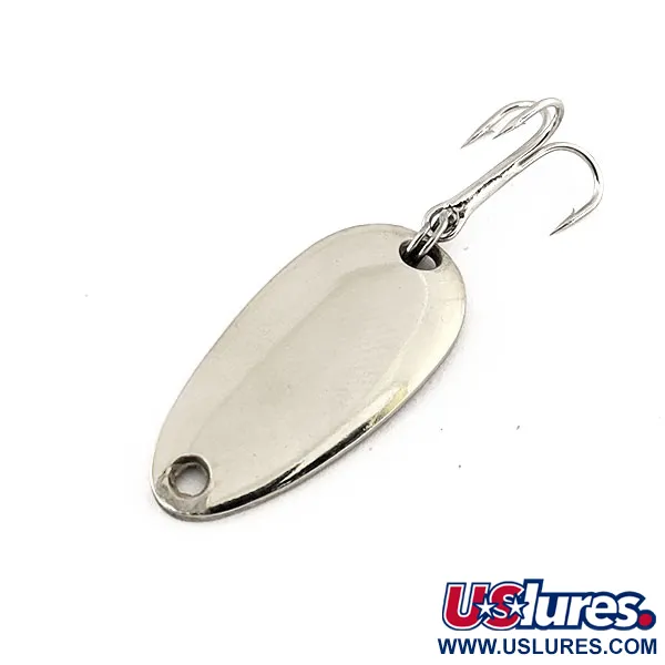 Duidelijk gestanst op de concave onderkant van deze vernikkelde lepel staan de woorden "LEN THOMPSON NO. 6", een ontwerp dat al decennia lang een vaste waarde is in tackleboxen. Met een lengte van precies 2,5 cm (1") en een licht gewicht van 3,5 g (1/8 oz), is dit kunstaas perfect voor het subtiel bevissen van roofvissen in diverse wateromstandigheden. De heldere nikkelen afwerking zorgt voor een schoon, reflecterend oppervlak om de schubben van een kleine aasvis na te bootsen. De druppelvorm is specifiek uitgebalanceerd voor een langzaam waggelende actie, een technisch kenmerk waardoor het merk dé keuze is voor snoek, zalm en meerforel. Dit specifieke exemplaar, artikelcode 11270, verkeert in 5/5 conditie, met een uitstekend bewaard gebleven body en een scherpe, zilverkleurige dreg. De hardware is stevig bevestigd via het nauwkeurig geboorde gat aan de achterzijde, klaar voor werpen, trollen of jiggen.