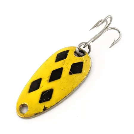 Afgewerkt met messing aan de achterzijde, draagt deze in Canada gemaakte klassieker het diepe "LEN THOMPSON NO. 6" stempel dat getuigt van zijn jarenlange erfgoed. Deze lepel, gecatalogiseerd onder productcode 11313, is voorzien van een levendig geel geëmailleerd blad gedecoreerd met vijf opvallende zwarte ruiten. Met een gewicht van 3,5 g (1/8 oz) en een compacte lengte van 2,5 cm (1"), is dit de favoriet voor licht werpend vissen of trollen op forel en baars. Dit exemplaar verkeert in 5/5 conditie, met uitstekend behouden lak en een schoon metalen oppervlak. Sinds 1929 gebruikt Len Thompson deze specifieke druppelvorm om kleine aasvisjes na te bootsen, een ontwerp dat al decennia vrijwel onveranderd is gebleven. Het kunstaas is uitgerust met een scherpe, zilverkleurige dreg, bevestigd met een standaard splitring aan de bovenzijde van de body.
