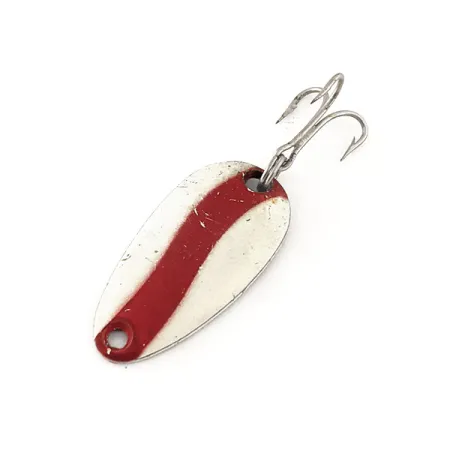 Een opvallende diagonale rode streep loopt over de crèmewitte voorzijde van deze compacte 2,5 cm (1 inch) lepel. Met een gewicht van 3,5 g (1/8 oz) draagt deze vintage vondst productcode 11497 en is het een vaste waarde in het Len Thompson assortiment. De achterzijde heeft een messing afwerking met een stempel die het identificeert als een "NO. 0" model, ondanks de catalogusaanduiding #6. Sportvissers vertrouwen op deze lepels vanwege hun karakteristieke langzame wiebelende actie bij het werpen of trollen op soorten zoals forel en baarsachtigen. Dit exemplaar verkeert in 5/5 conditie, met lichte oppervlakkige slijtage en fijne haarscheurtjes in de lak, samen met wat verkleuring en oxidatie op het messing en de originele dreg. Het druppelprofiel is klassiek Len Thompson, een ontwerp dat sinds 1929 wordt geproduceerd om kleine aasvisjes na te bootsen.