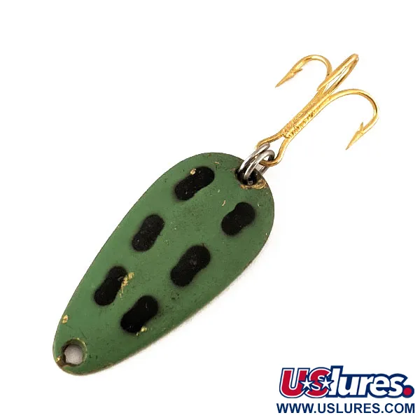 Groene verf met kenmerkende zwarte ovale markeringen geeft de voorzijde van deze 5g (3/16oz) Len Thompson #7 lepel zijn karakteristieke uiterlijk. Met een lengte van 3,4cm (1 1/4") heeft dit exemplaar een solide messing constructie die zichtbaar is aan de achterzijde, waar de naam Len Thompson en het figuur-acht logo in het metaal zijn gestempeld. De hardware bestaat uit een goudkleurige dreg bevestigd via een zilverkleurige splitring, een configuratie ontworpen voor duurzaamheid bij het werpen of trollen in verschillende zoetwateromgevingen. Gebruikssporen zijn zichtbaar als minimaal verfverlies langs de randen en lichte oppervlaktemarkeringen op de messing achterkant, wat resulteert in een goed bewaard gebleven conditiescore van 4/5. Deze Canadese klassieker, herkenbaar aan productcode 11191, maakt gebruik van een gestanst messing lichaam dat een metalen flits biedt tegenover de matgroene voorzijde. De gestempelde letters op de achterkant blijven scherp, wat de kwaliteit van het vintage productieproces benadrukt.