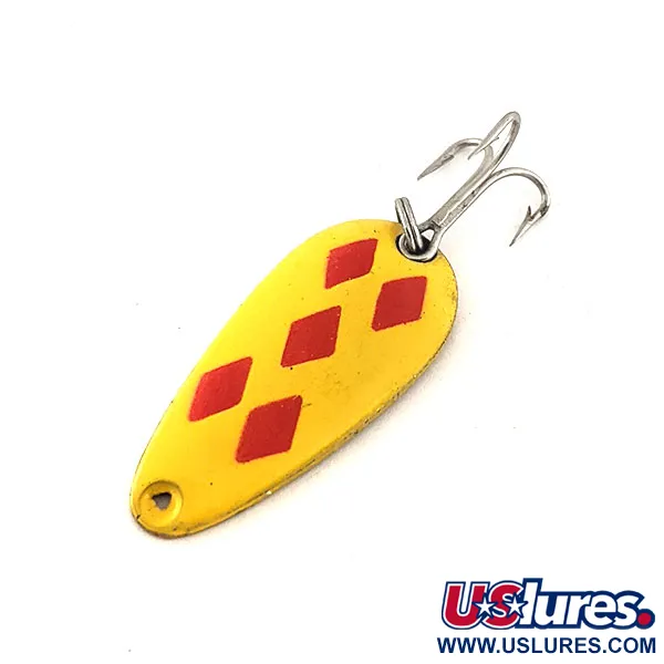 Vijf rode ruiten zijn scherp gestencild tegen een levendig geel emaille, wat het iconische "Five of Diamonds"-patroon vormt dat deze Canadese lepels sinds 1929 beroemd heeft gemaakt. Dit exemplaar is een Len Thompson #7, met een lengte van 3,4 cm (1 1/4") en een gewicht van 5 g (3/16 oz). De achterzijde is voorzien van een glanzende messing afwerking, diep gestempeld met het merkteken "LEN THOMPSON No.7" als teken van authentiek vakmanschap. Ontworpen voor diverse technieken waaronder werpen en trollen, is het kunstaas uitgerust met een scherpe, zilverkleurige dreg bevestigd via een stevige splitring. Geregistreerd onder productcode 11533, verkeert de lepel in 5/5 conditie, met een glad oppervlak en contrastrijke lak. Het compacte profiel is specifiek verzwaard om de aanwezigheid van kleine aasvissen in de waterkolom na te bootsen.