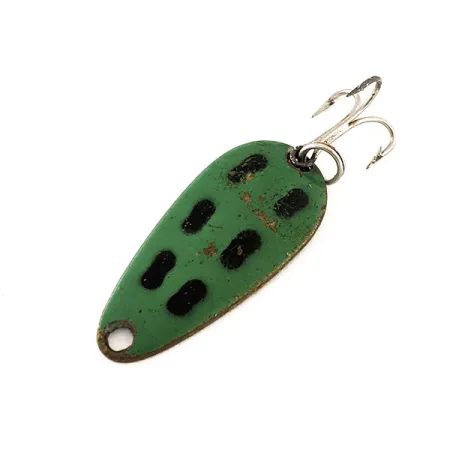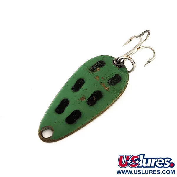 Deze Canadese lepel van 3,5 cm (1 1/2") is uitgevoerd in een levendig kikkerpatroon en heeft een grasgroene bovenkant met kenmerkende zwarte ovale vlekken. Op de messingkleurige onderkant staat duidelijk het merk "LEN THOMPSON NO 7" gestempeld, wat verwijst naar de rijke historie van een fabrikant die al sinds 1929 een vaste waarde is. Met een gewicht van 5 g (3/16 oz) is de lepel ontworpen voor een langzaam waggelende actie die een kleine aasvis imiteert. De zilverkleurige dreg is bevestigd via een betrouwbare splitring en de algehele staat is een nette 4/5, met lichte gebruikssporen. Onder productcode 11545 zijn de druppelvorm en de messing basis klassieke kenmerken van de Len Thompson-lijn.