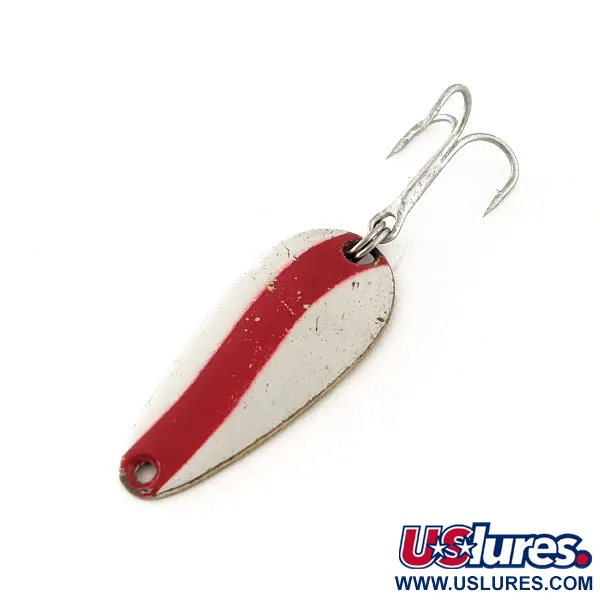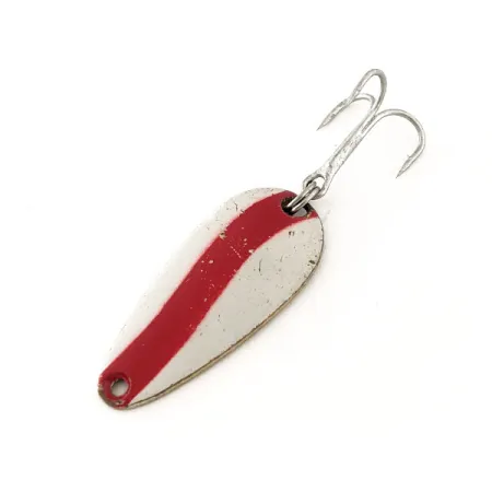 De stempeling 'LEN THOMPSON No. 7' op de messing achterzijde identificeert deze lepel als een Canadese klassieker van een fabrikant die al sinds 1929 actief is. Een opvallende rode golfstreep over het wit gelakte oppervlak zorgt voor een hoog contrast, bedoeld om de aandacht te trekken van roofvissen zoals snoek of meerforel. Met een lengte van precies 3,5 cm (1 1/2 inch) is het druppelvormige profiel een bekend gezicht in de tacklebox van menig ervaren visser. Met een gewicht van 5 g (3/16 oz) biedt het een solide gevoel tijdens het werpen of licht trollen onder diverse omstandigheden. De witte lak vertoont enkele lichte krasjes en gebruikssporen door ouderdom, wat het een conditiescore van 5/5 oplevert. Bekend om zijn karakteristieke langzame wiebelende actie, is dit model No. 7 een betrouwbare keuze voor passieve vis. Het kunstaas is uitgerust met een robuuste zilveren dreg en heeft productcode 11642.